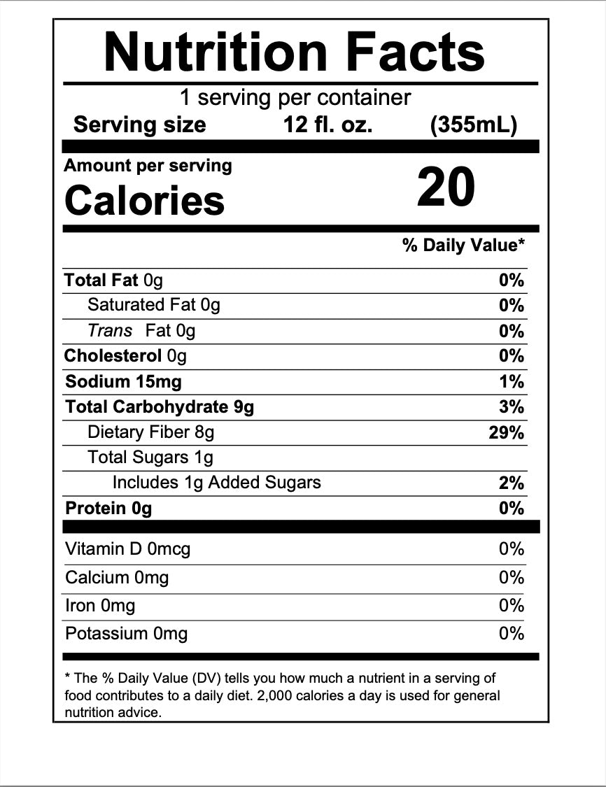 A deliciously refreshing pre-biotic soda made with natural strawberry and watermelon flavoring. 20 calories, 8g dietary fiber, and 1g of sugar.